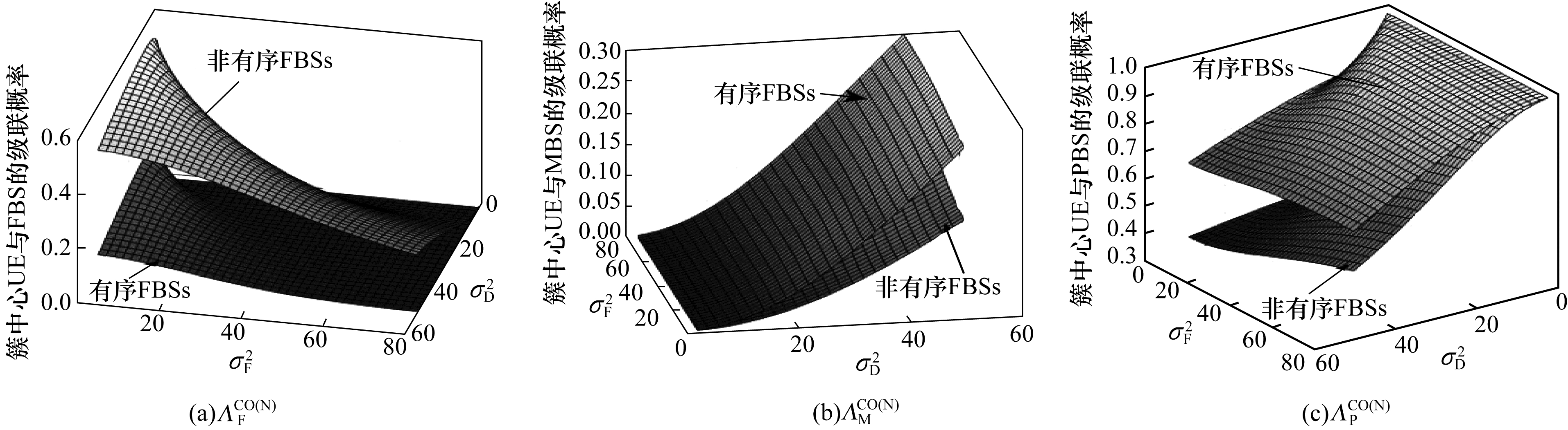| 图 3 目标簇中心UE与FBS、MBS和PBS的级联概率 Fig. 3 Association probability of target cluster-center UE with FBS, MBS and PBS | |