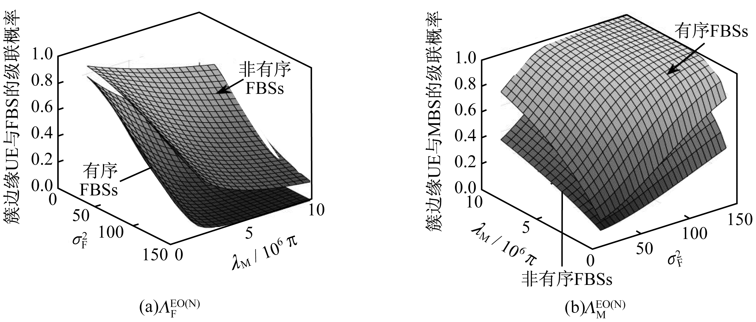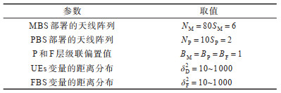 | 图 4 目标簇边缘UE与FBS和MBS的级联概率 Fig. 4 Association probability of target cluster-edge UE with FBS and MBS | |