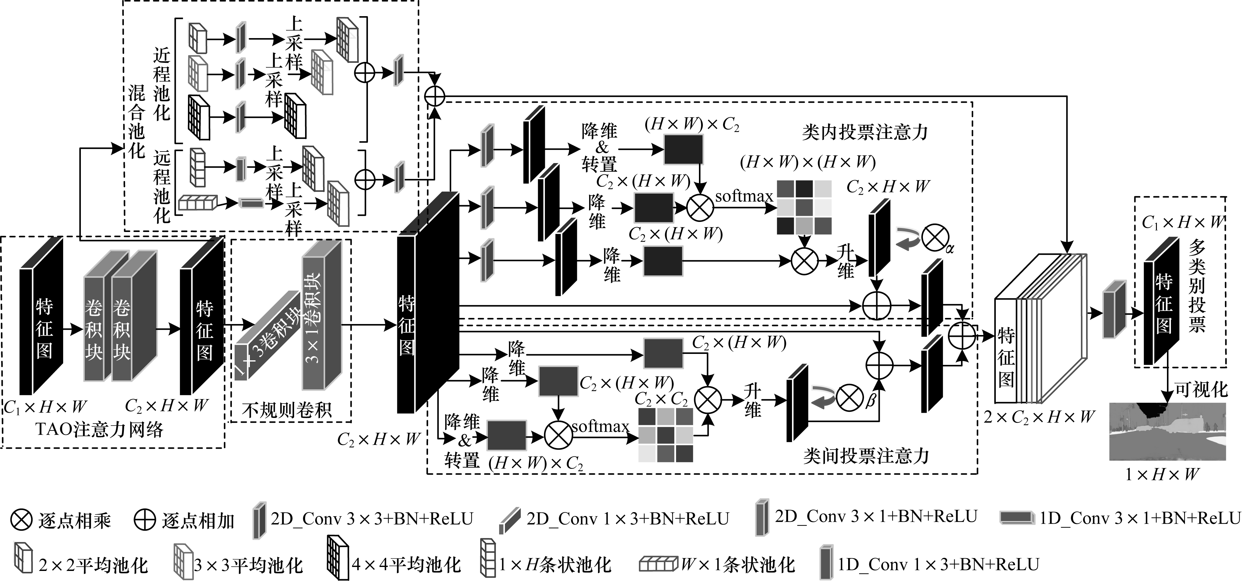 2 外接多尺度投票网络 2.1 投票网络总体结构图 1所示为投票网络结构,其中每个模块已用虚线框出。其中:通道数C1为分割类别数;通道数C2为网络层数,设为64;H为高度,值为1 024;W为宽度,值为2 048;