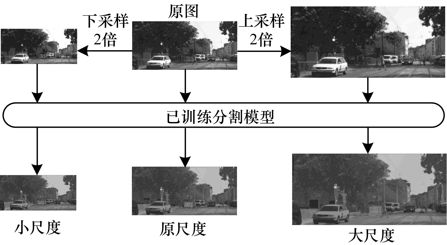 针对上述训练成本过高的问题,本文期望复用具有最高精度的模型,并在其基础上改善模型在小目标、长条状目标、目标边缘处的分割效果。得益于现有的语义分割网络通过采用随机尺度缩放进行数据增强,使图像放缩后也能保持较高分割精度的方法,本文定量分析图像缩放后的不同分割效果,将放缩后的各尺度图像输入同一已训练的分割网络中,以达到提高分割精度的目的。