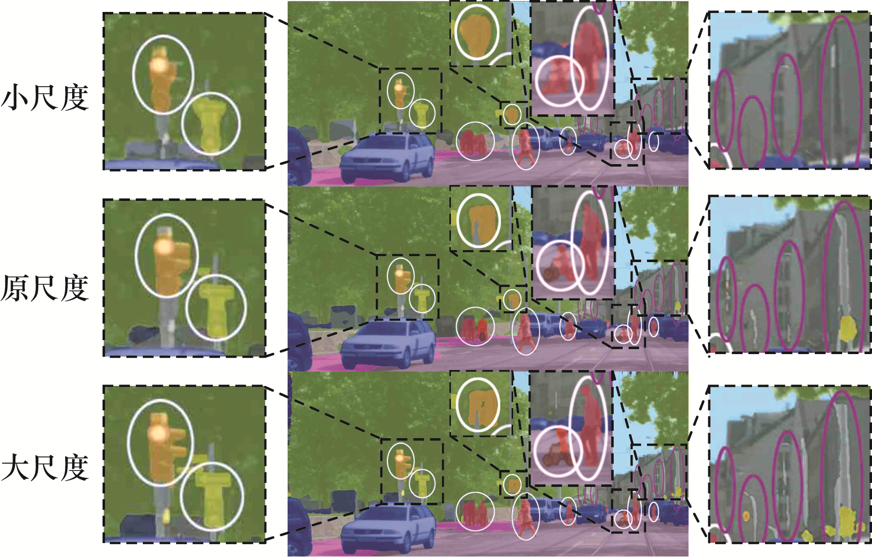 3)在左3虚线框中,在分割小目标时,大尺度图像能够正确分割出骑手小目标,而原尺度、小尺度图像将骑手误识别成行人,且边缘分割效果明显弱于大尺度图像。