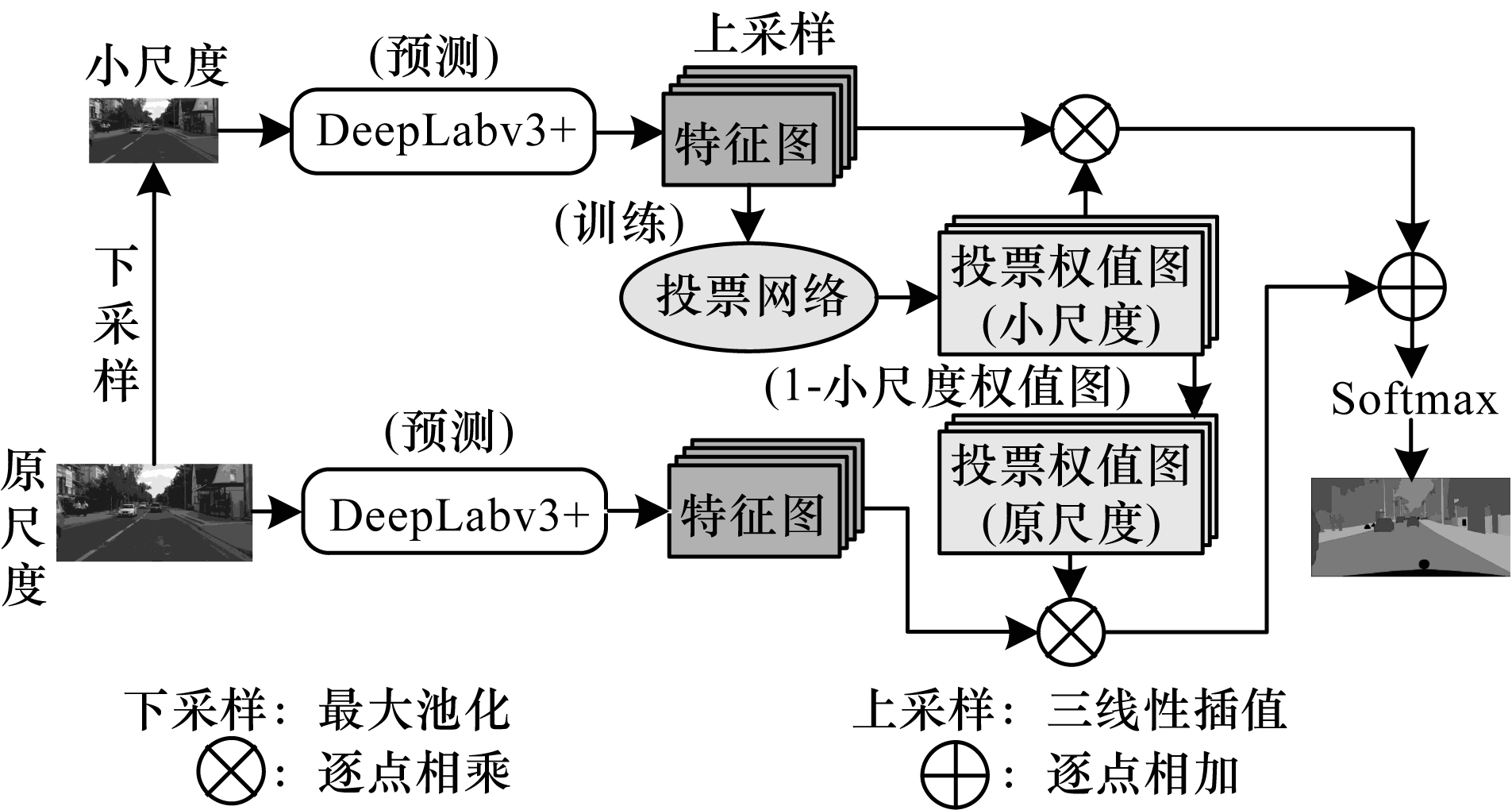 如图 4所示,将原尺度图像和下采样2倍的图像分别输入已经过训练的DeepLabv3+网络中,得到各尺度预测特征图