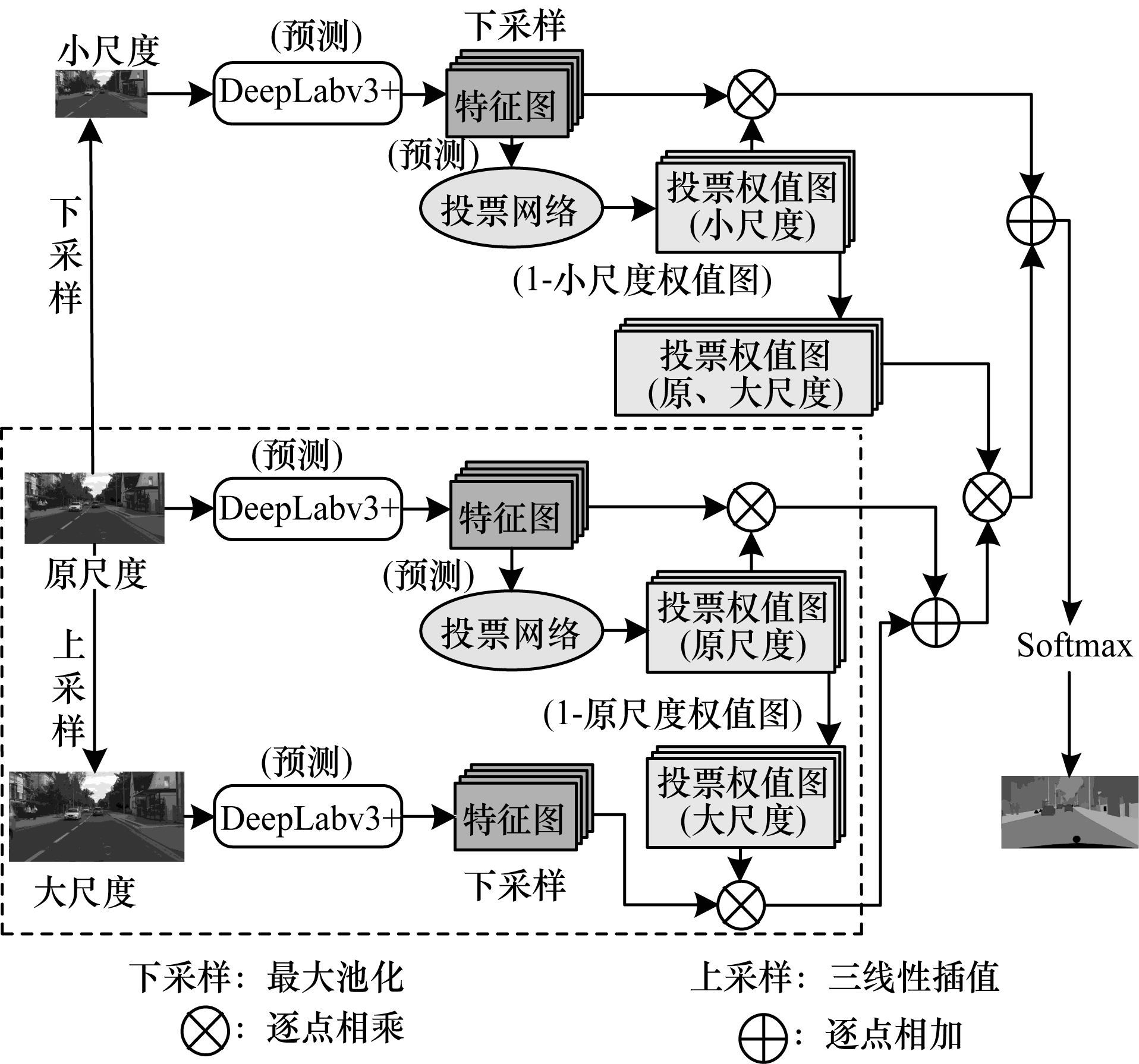 将原图分别进行上、下采样,其中,图 5虚线框内为大尺度图像和原图的成对预测结构(与训练结构相同),并得到大尺度图像和原图投票的预测结果