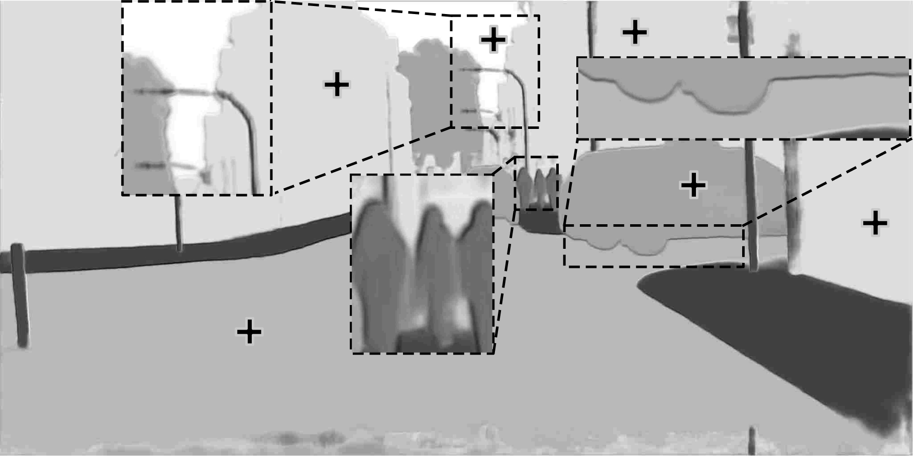 2)在目标边缘处,如在左3虚线放大框中,车辆边缘在大尺度权值图中更趋近白色,在原尺度中趋近黑色,即网络在边缘处更趋向于相信大尺度的分割结果。在左2虚线放大框中,也可明显发现在边缘处更趋近白色。