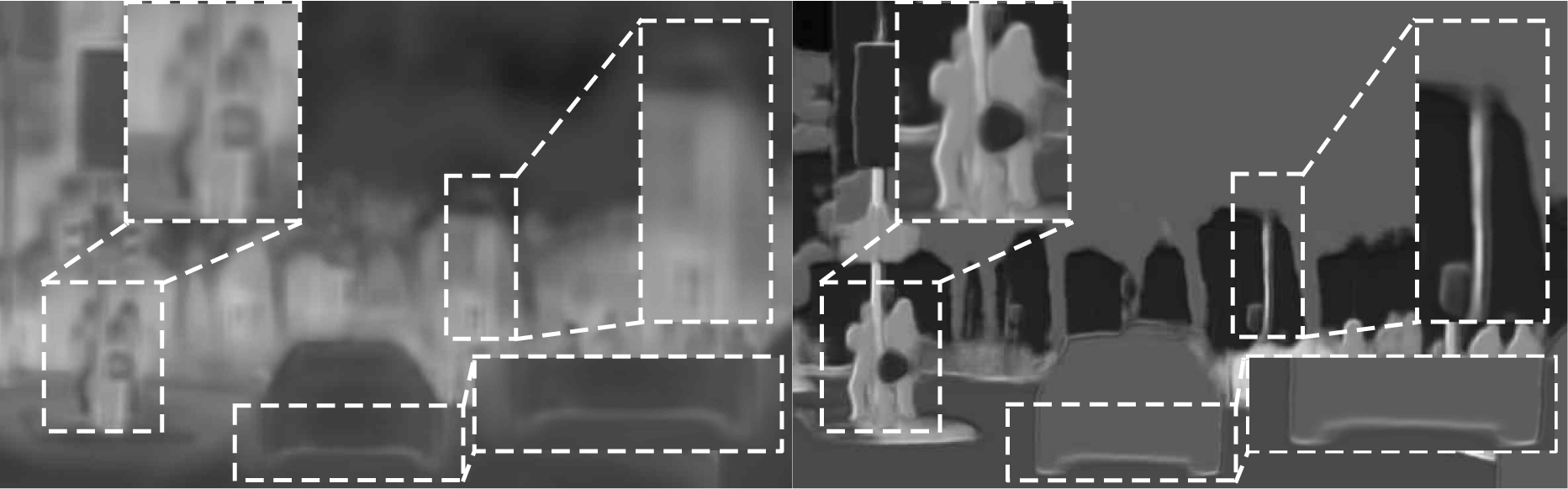 为进一步显式分析,将TAO等[15]的大尺度注意力权值图与本节模型外方式拟合出的投票权值图进行对比。如图 8所示,为方便叙述,按每组虚线框出现的顺序对虚线框进行标号,从左至右分别为左1、左2、左3、左4。其中左1为TAO等的大尺度权值图,左4为本文网络的大尺度权值图。对比发现,本文网络对小、长条状目标更敏感。如两图中最左边虚线放大框所示,左4的行人(小目标)比左1更清晰,边缘勾勒也更明显。另外,如两图中最右边虚线放大框所示,左1几乎丢失了路杆信息(长条状目标),而左4的路杆信息被成功捕获。如两图中的中间虚线放大框所示,车辆边缘被成功勾勒出了边缘,相较左1而言,左4图片更清晰。从整体上,左4的层次感也优于左1图片,即尺度间的投票权值相差更大,越偏向于正确尺度的分割图。