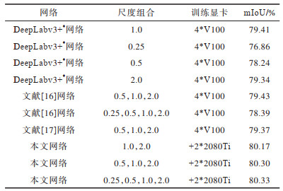为验证本文网络的有效性,选用经过开源框架OpenMMLab训练的DeepLabv3+最佳网络(DeepLabv3+*网络)作为基线网络与其他网络进行对比,测试不同网络对不同尺度图像的分割精度。此外,将文献[16]所提网络和文献[17]所提网络在不同图像尺度(图像放缩为原尺度后,对应像素求平均值)上进行实验。结果如表 2所示,其中:1.0代表图像原尺度,2.0代表图像的长宽各放大2倍,0.5代表图像的长宽各缩小2倍,0.25代表图像的长宽各缩小4倍;分割网络采用4块V100显卡训练,投票网络仅采用2块2080Ti显卡训练,由于训练投票网络需在分割网络模型基础上进行,为进行区分,将本文方法的训练显卡用+2*2080Ti表示(下同)。由表 2可知,实验结果与前文所述相同,mIoU的提升效果不佳,但本文网络的精度提升幅度最大。与DeepLabv3+*网络在尺度为1.0的图像下的mIoU值相比,本文网络在组合原尺度和大尺度图像时,mIoU提升0.76个百分点,在组合3个尺度时,mIoU提升0.89个百分点,在组合4个尺度时,可提升0.92个百分点。由表 2还可以得知,投票网络在最佳网络模型基础上可达到的较高分割精度为80.30%。