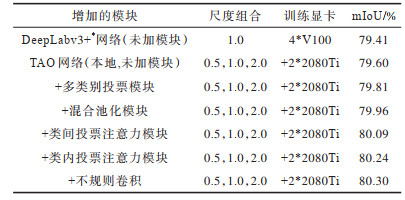 3.5 消融实验为验证本文网络中各子模块的有效性,选用经过开源框架OpenMMLab训练的DeepLabv3+最佳网络(DeepLabv3+*网络)进行消融实验,并量化分析各模块的作用,即在Deeplabv3+*基础上加入各模块,从而分析本文网络各模块的作用。该实验中模块的添加为逐渐累积的过程,比如在添加多类别投票模块(+多类别投票模块)的基础上,再添加混合池化模块,以此类推,结果如表 4所示,其中,TAO网络(本地)表示将TAO网络在本文网络上进行实验。