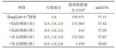 对比表 5中TAO网络(外)与TAO网络(内)的数据可知,TAO网络(外)的mIoU略低于TAO网络(内),但需训练的模型大小却大幅降低,缩小了413倍。对比本文网络(内)与本文网络(外)的数据可知,本文网络(外)的mIoU高于本文网络(内),其训练模型缩小了102倍。