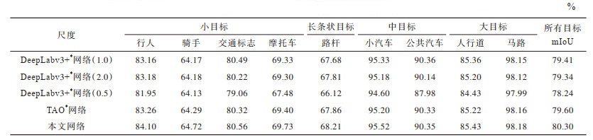 为对比不同类别的mIoU,在Cityscapes数据集中选取有代表性的类,包括交通标志、行人、骑手、摩托车等小目标的类;路杆等长条状目标的类;小汽车、公共汽车等中目标的类;人行道、马路等大目标的类。选用经过开源框架OpenMMLab训练的DeepLabv3+最佳网络(DeepLabv3+*网络)进行实验,结果如表 6所示。由表 6可知,前3行分别为不同尺度(0.5、1.0、2.0)图像输入DeepLabv3+*网络的各类分割精度,表 6最后2行分别为以模型外训练方式的TAO*网络与本文网络在0.5、1.0、2.0尺度组合下的分割精度。在表 6前3行中,原图的总精度相对最高,小尺度总精度相对较低。在具体类中,原尺度在大部分类中分割精度最高,小尺度中大目标的类别分割精度与原图的差距小于其他类,大尺度中小、长条状目标的分割精度优于原图。但内部分割间断拉低了整体精度,而本文通过结合小、原尺度的分割结果弥补了该缺陷。