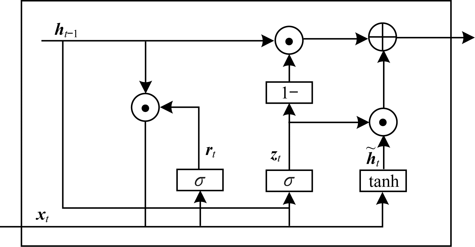 $ \left\{\begin{array}{l}{\boldsymbol{z}}_{t}=\sigma ({\boldsymbol{W}}_{z}{\boldsymbol{x}}_{t}+{\boldsymbol{U}}_{z}{\boldsymbol{h}}_{t-1}+{\boldsymbol{b}}_{z})\\ {\boldsymbol{r}}_{t}=\sigma ({\boldsymbol{W}}_{r}{\boldsymbol{x}}_{t}+{\boldsymbol{U}}_{r}{\boldsymbol{h}}_{t-1}+{\boldsymbol{b}}_{r})\\ {\boldsymbol{a}}_{t}=\mathrm{t}\mathrm{a}\mathrm{n}\mathrm{h}\left({\boldsymbol{W}}_{a}{\boldsymbol{U}}_{a}\right({\boldsymbol{h}}_{t-1}\odot {\boldsymbol{r}}_{t})+{\boldsymbol{b}}_{a})\\ {\boldsymbol{h}}_{t}=(1-{\boldsymbol{z}}_{t})\odot {\boldsymbol{h}}_{h-1}+{\boldsymbol{z}}_{t}\odot {\boldsymbol{a}}_{t}\end{array}\right. $ | (9) |