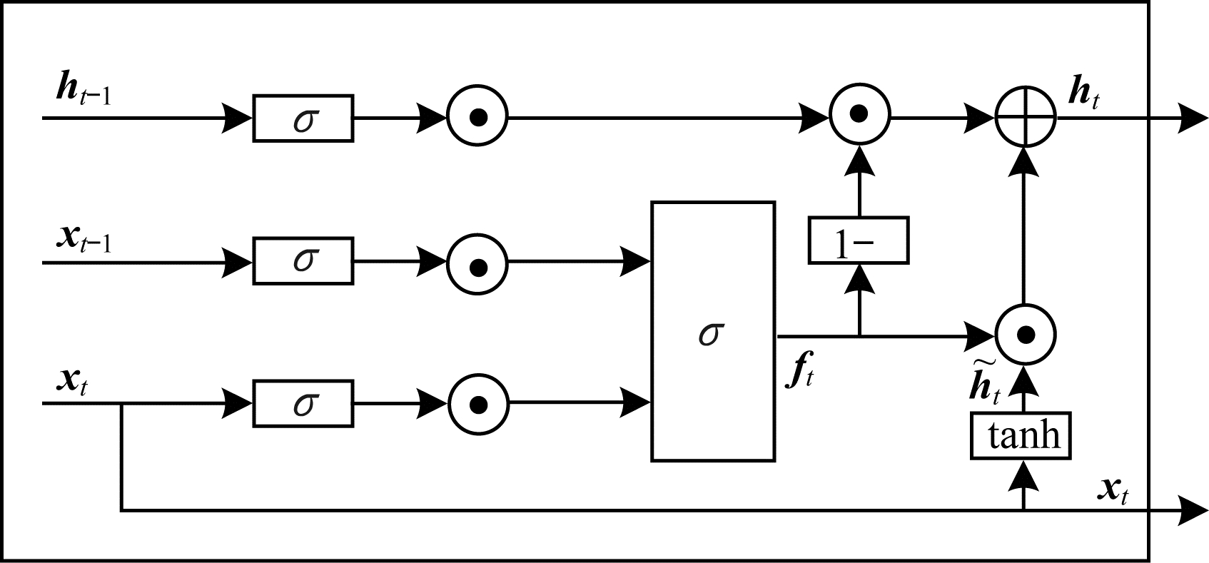 $ {\boldsymbol{h}}_{t}={\boldsymbol{f}}_{t}\odot {\tilde{\boldsymbol{h}}}_{t}+(1-{\boldsymbol{f}}_{t})\odot {\widehat{\boldsymbol{h}}}_{t-1} $ | (13) |
