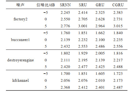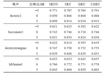 3.2 结果分析分别对4层的GRU、SRNN、SRU以及CGRU网络结构模型进行实验。在-5 dB、0 dB、5 dB这3种信噪比条件下,测试集上的factory2、destroyerengine、buccaneer1、hfchannal 4种噪声[27]分别与测试集中的500条纯净语音进行混合,利用4种网络模型进行语音增强对比实验,从而验证所提网络的有效性。