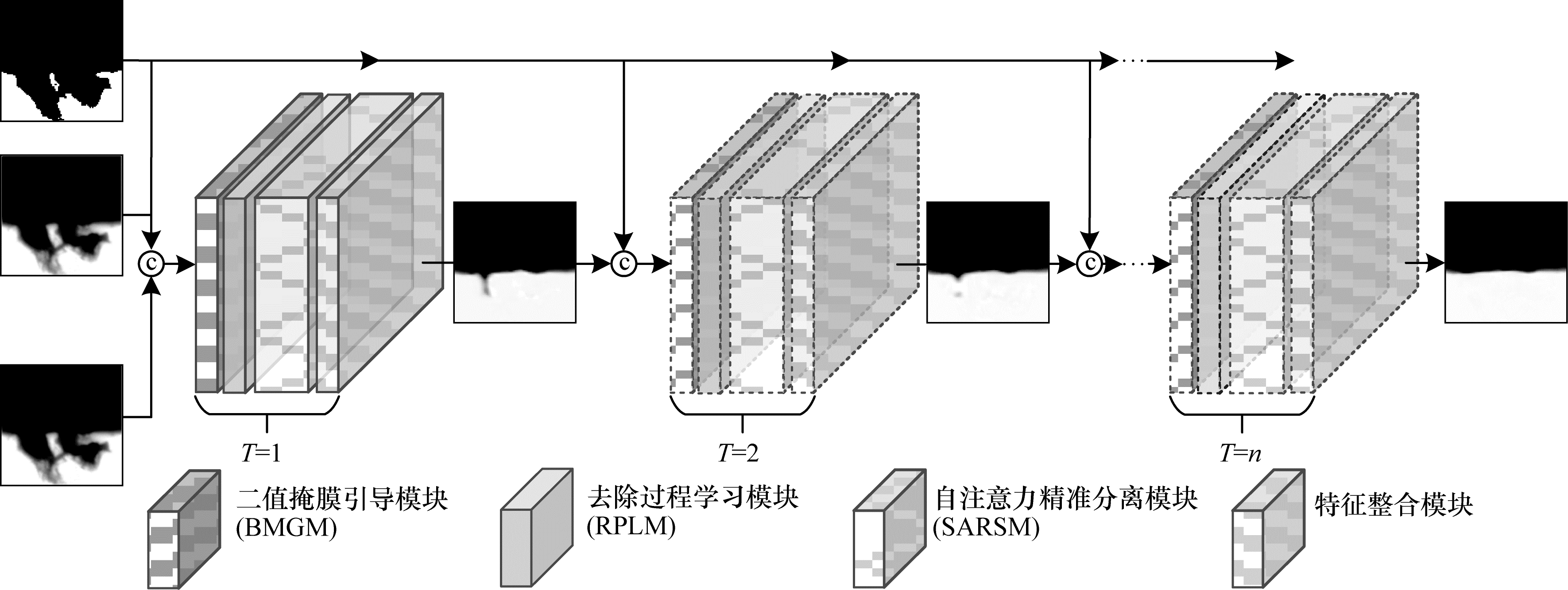 1 本文方法 1.1 整体网络结构本文所提刀具附着物去除网络ARNet的结构如图 1所示,本文参考了PReNet[15]网络的设计思路,在特征提取模块中引入自注意力机制(Self-Attention,SA)[16]加强特征提取能力。同时,在残差结构中引入深度可分离卷积[17],减少自注意力机制增加的计算量,从而设计出效率更高、参数量和计算量更少的ARNet。该网络包含二值掩膜引导模块(Binary Mask Guided Module,BMGM)、去除过程学习模块、自注意力精准分离模块(Self Attention Refined Separation Module,SARSM)和特征整合模块。此外,根据刀具图像的背景特征,调整了网络的递归次数,其中递归T次后的输出图像公式如下: