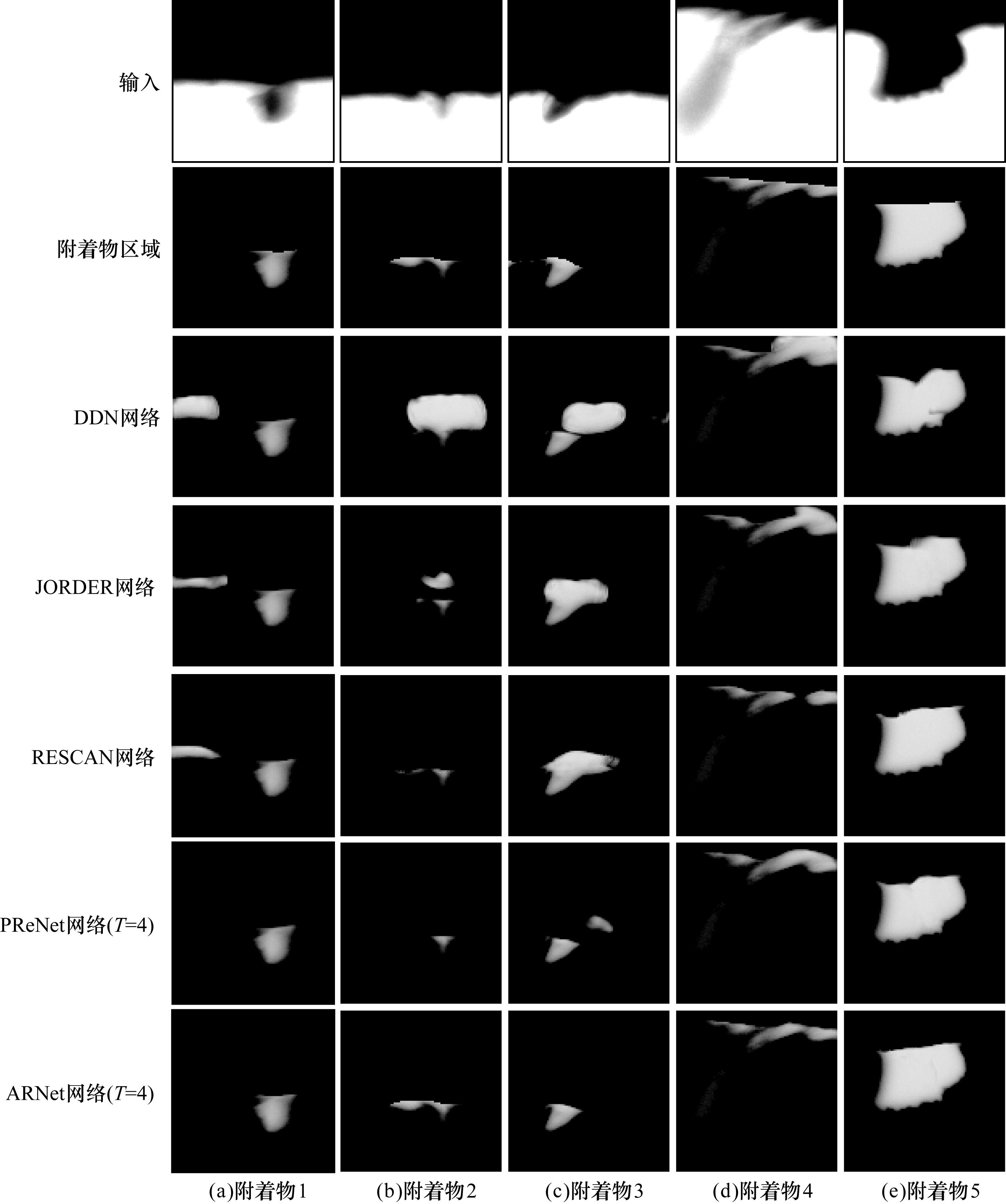 如图 5所示,本节将选取3.3节递归实验中网络精度趋于稳定的ARNet(T=4),并与DDN[19],JORDER[20]、RESCAN[21]和PReNet[15]网络进行对比以验证本文网络的有效性。图 5从上到下依次为含附着物的刀具图像、Ground-Truth附着物区域、DDN网络、JORDER网络、RESCAN网络、PReNet网络和本文网络的附着物去除结果。可以看出本文网络对刀具边缘的修复效果较好,能准确地分离出刀具区域和附着物区域,并且没有出现误去除附着物的现象。在其他网络的实验结果中,附着物和刀具的衔接部分出现了不规则的突起,而本文网络恢复的豁口边缘更平滑。此外,本文网络针对不同种类的附着物均能保持较高的精确度,鲁棒性良好。