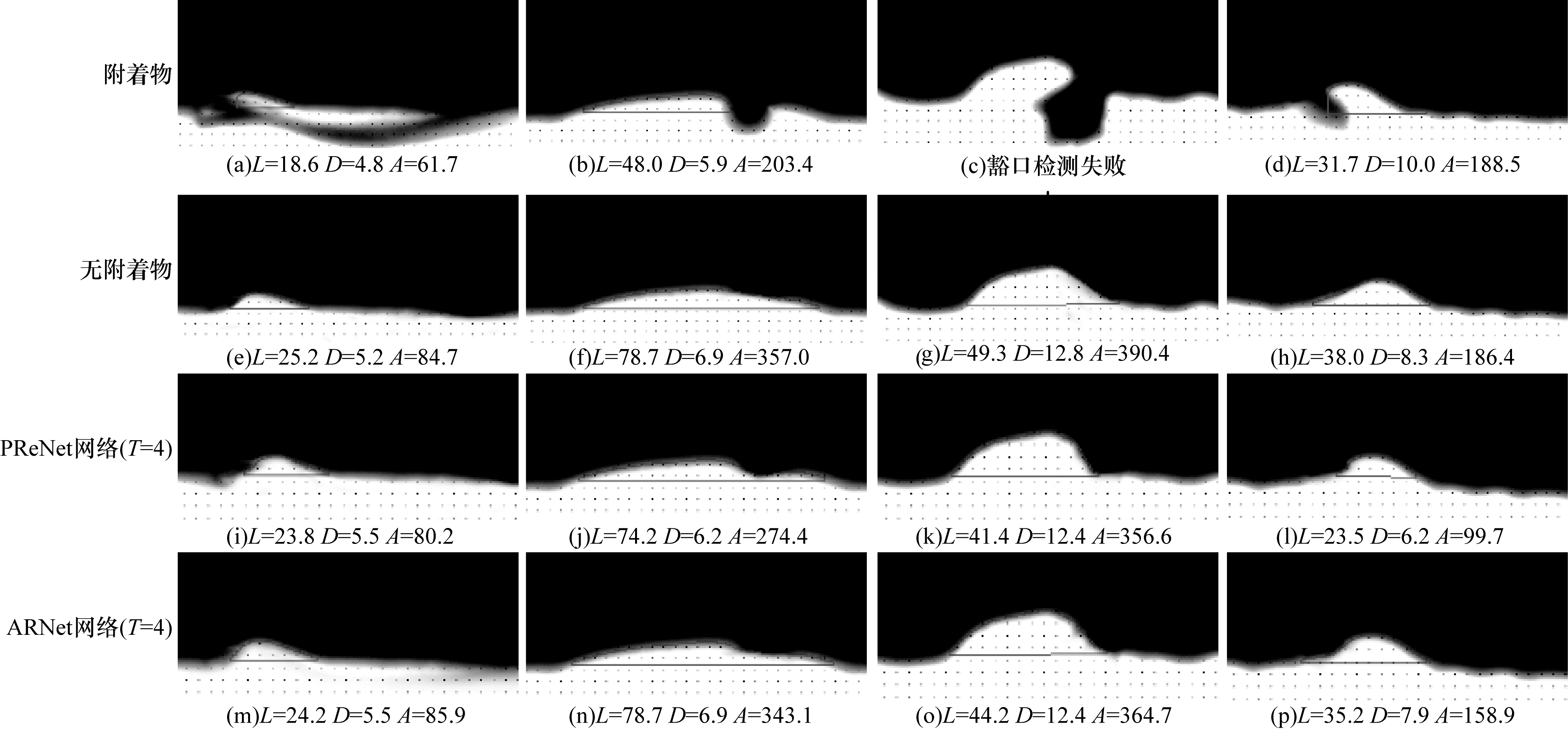 如图 6所示为豁口1~4的检测效果图(彩色效果见《计算机工程》官网HTML版)。图 6中的L、D和A分别表示豁口的长度、深度和面积。图图 6(a)、图 6(b)和图 6(d)的豁口在去除附着物前,由于附着物的遮挡,只检测出部分的豁口区域。如图 6(b)、图 6(j)和图 6(n)所示,经过PReNet网络和ARNet网络去除附着物后,豁口面积从203.4 μm2分别恢复到274.4 μm2和343.1 μm2,豁口区域恢复了34.9%和68.7%。图 6(c)中因附着物遮挡过多导致豁口漏检,经过网络处理后,图 6(k)和图图 6(o)漏检的豁口被完整检出,降低了豁口检测系统的漏检率。由实验结果可知,ARNet和PReNet网络均能在一定程度上去除附着物。
