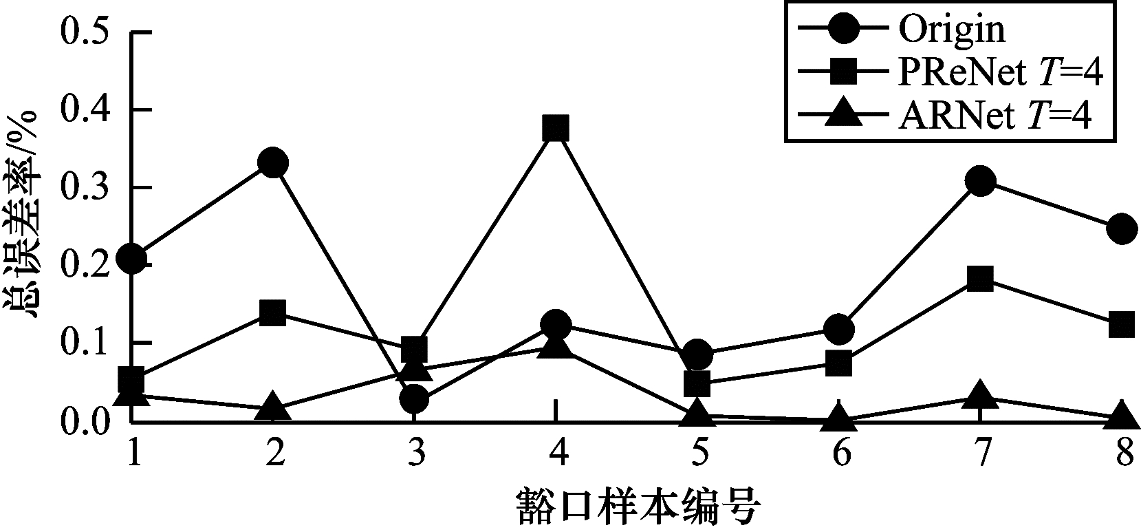 豁口面积过大是电池极片产生毛刺的最重要因素,而豁口深度和豁口长度对产生毛刺相对敏感。因此,在计算检测总误差率时,根据豁口几何参数对产生毛刺的敏感程度,设定面积、深度和长度的相应权重分别为0.5、0.3和0.2。豁口样本的总检测误差率如图 7所示,总检测误差率由长度、深度和面积分别加权求和得到。在豁口编号为4时,PReNet网络在T=4时出现误检,附着物去除后的检测结果比无附着物的检测结果更差。本文网络在8个豁口样本的误差曲线最低,表明本文网络ARNet在T=4时,附着物去除效果更优。