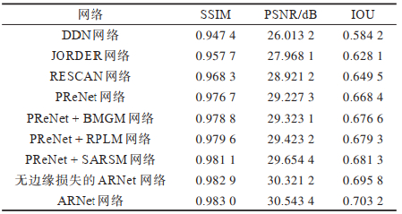 定量的评价指标结果如表 2所示,本文提出的ARNet网络分割效果最好。本文以PReNet网络为基线网络,对本文提出的BMGM、RPLM和SARSM这3个模块进行了消融实验。在PReNet的基础上,二值掩膜引导模块(PReNet + BMGM)引入二值化后的掩膜特征后,能在多次递归过程中引导去除的部位,从而提高去除效果。去除过程学习模块(PReNet+RPLM)比引入的BMGM模块在3个评价指标上提升更大,说明去除过程学习模块在多次递归结构下,能学习到去除部位的位置信息,而BMGM模块以网络输入特征为切入点,丰富了特征信息,却在一定程度上缺少了掩膜中附着物的位置信息。去除部分和自注意力精准分离模块(PReNet+SARSM)在评价指标上提升最大,说明编解码机构能提炼出网络中的有效特征。结合自注意力机制,注意力分数矩阵在像素级上进行特征的加权强化,对附着物去除起到了良好的促进作用。同时,本文提出的加权边缘损失