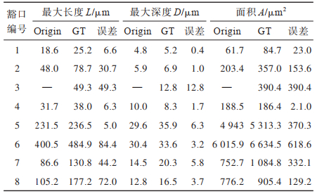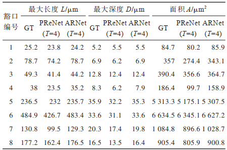 本节选取上述主观和客观结果最好的ARNet和PReNet网络进行豁口检测效果的对比实验。实验从TA567数据集中随机选取8个豁口样本,分别用上述2种网络去除附着物,并在豁口检测系统中分析豁口的长度、深度和面积参数,实验结果如表 3所示,其中GT表示无附着物。对于豁口的长度参数,本文网络比PReNet网络更接近无附着物的豁口长度;在豁口深度比较中,网络在豁口1和豁口3上具有相同的结果,分别为5.5 μm和12.4 μm。其中网络在豁口1的深度结果大于真实值5.2 μm,相差0.3 μm,均误差在允许范围内。在豁口2和豁口6结果中,ARNet网络精准还原豁口深度,误差为0;在面积参数中,得益于豁口长度和深度还原精度较高,本文网络还原的面积更接近真实值。实验结果表明,本文网络去除附着物后,豁口检测结果更优。