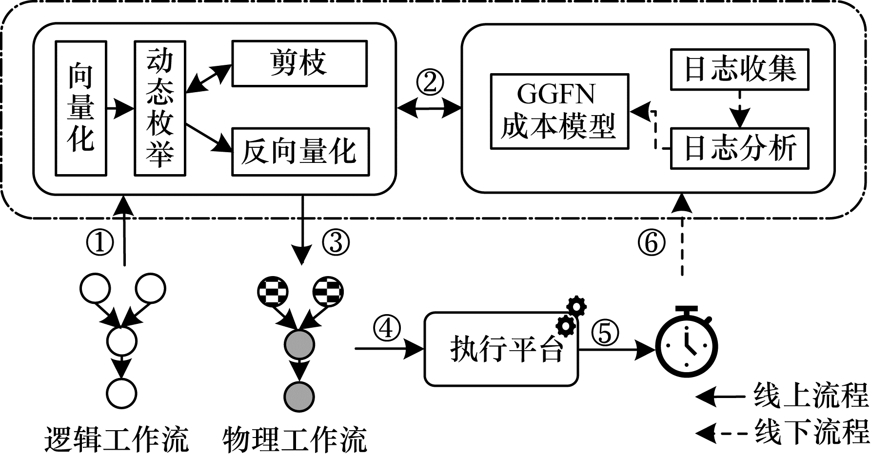 为了提升跨平台工作流的执行性能并克服已有优化工作中的问题,本文提出一种基于GGFN模型的跨平台工作流优化方法,该方法的整体优化框架如图 1所示。