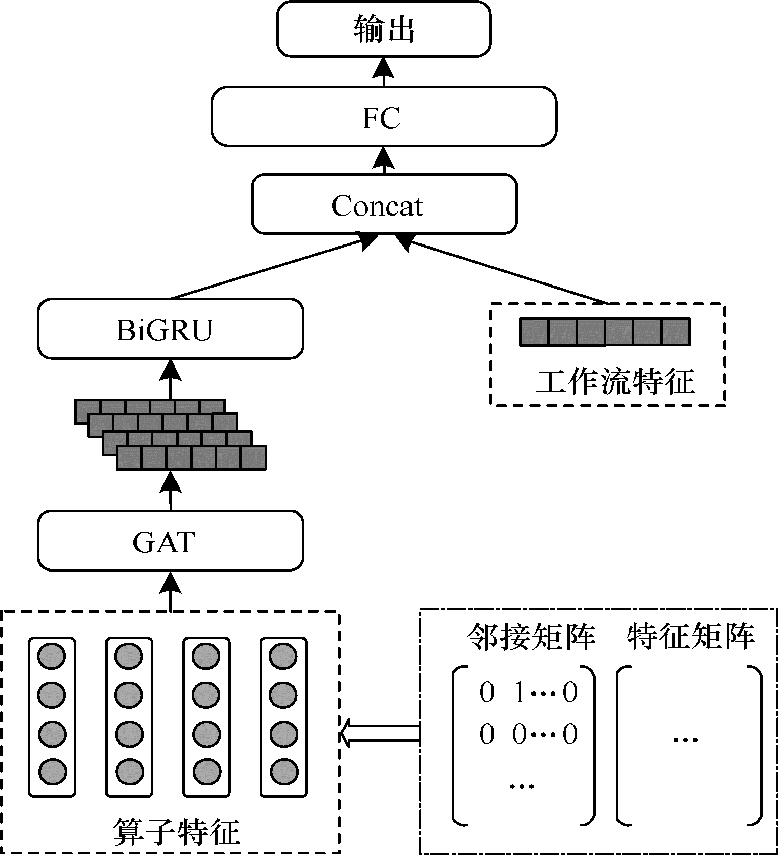 3.2 GGFN模型对物理工作流进行准确的成本估计是本文实现高效跨平台工作流优化的重要基础。在总结了已有工作的不足之处后,本文提出了基于图注意力神经网络(GAT)与门控循环单元(GRU)的GGFN成本模型,其结构如图 2所示。该模型包含两个输入部分,一是算子特征,二是工作流特征。算子特征将经过图注意力网络的处理来捕捉工作流的整体结构信息以及各个算子之间的交互关系。双向门控循环单元将对算子之间的运行时序关系进行挖掘并获得相应的运行状态信息,其编码结果将与工作流特征进行融合。融合后的特征将被输入到3层全连接层进行工作流运行时间成本的预测,并在输出层得到预测结果。