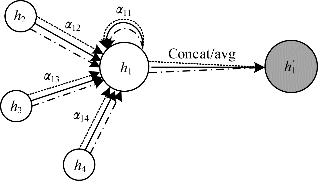 | $ {h}_{i}^{{'}}=\sigma \left(\frac{1}{K}\sum\limits_{k=1}^{K}\sum\limits_{j\in {N}_{i}}{\alpha }_{ij}^{k}{W}^{k}{h}_{j}\right) $ | (3) |