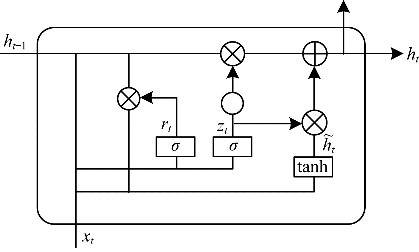 | $ {h}_{t}=(1-{z}_{t})\times {h}_{t-1}+{z}_{t}\times {\tilde{h}}_{{}_{t}} $ | (7) |