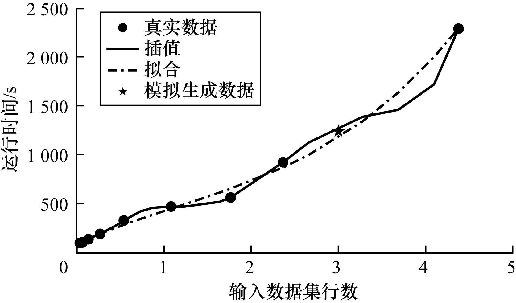 图 5为某次训练数据生成的示意图。根据工作流输入数据的行数以及实际运行时间,分别对其进行5阶多项式插值以及3阶多项式拟合。而对于模拟生成的数据,取插值和拟合结果的均值作为该工作流在指定输入数据集行数的运行时间标签。