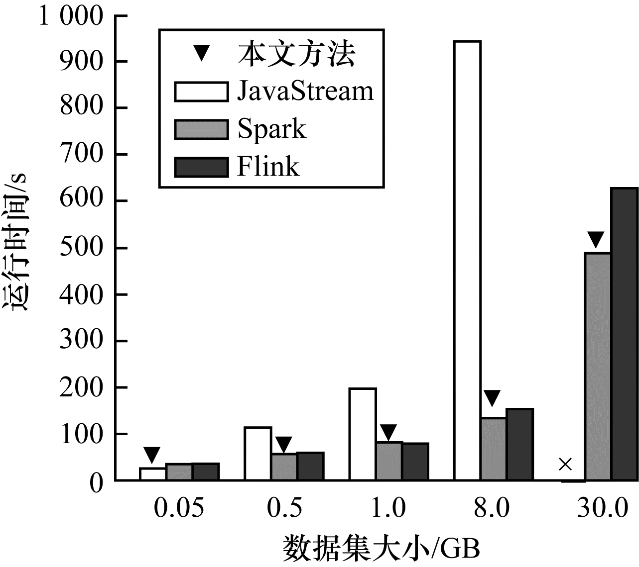 4.3 单平台下优化效果分析首先评估基于GGFN模型的跨平台工作流优化方法在平台选择时的优化效果。为了使选择效果更加明显,在实验中设置为仅选择一个平台来运行相应的任务工作流。本次实验选择了WordCount、PageRank和Word2Vec三个任务作为批处理、图计算以及机器学习任务的工作流代表来进行实验,并分别在不同平台上运行,以此观察优化方法能否为相应的工作流选择最佳的执行平台。图 6~图 8显示了在改变数据集大小的情况下3个不同任务在各自平台下的运行时间。其中,倒三角表示本文优化方法在相应数据输入情况下为工作流选择的执行平台。可以发现,图中结果显示了不同工作流在不同平台上的运行时间是存在显著差异的,部分平台运行时间差距达到5倍以上,这也表明通过优化为工作流中的算子选择合适的平台对加快任务运行的重要性。
