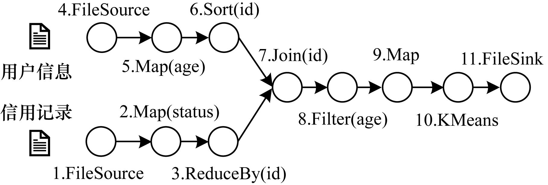4.4 多平台下优化效果分析本节将评估基于GGFN模型的优化方法能否利用多平台优势加速任务工作流的执行。实验使用一个真实环境下的用户信用相关性分析任务作为实验工作流,如图 9所示。该工作流包含11个算子,使用Credit-Card-Approval-Prediction数据集作为工作流输入。该数据集包含用户信息和用户信用记录两个部分。该工作流对此数据集进行处理后使用Kmeans分析影响用户信用的相关因素。