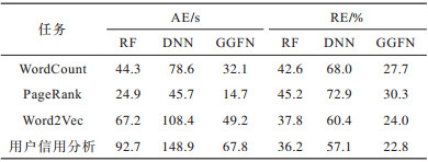 4.5 GGFN模型分析成本模型旨在帮助优化方法根据预测的运行成本选择最佳的物理工作流并避免出现最坏的情况,因此准确的成本估计至关重要。为了评估GGFN模型对于成本估计的准确性,本文根据文献[9]复现了Robopt优化器中基于随机森林的成本模型。同时为了验证GGFN模型对于时间和结构信息的提取能力,本文将其与深度神经网络(Deep Neural Networks,DNN)进行比较。DNN包含8个隐藏层,每个隐藏层有256个神经元,其模型输入是算子特征和工作流特征向量的串接。在此基础上,本文在WordCount、Word2Vec、PageRank和用户信用分析4个任务上分别评估了GGFN模型、随机森林(RF)模型以及DNN模型的绝对误差值(AE)以及相对误差值(RE),如表 1所示。